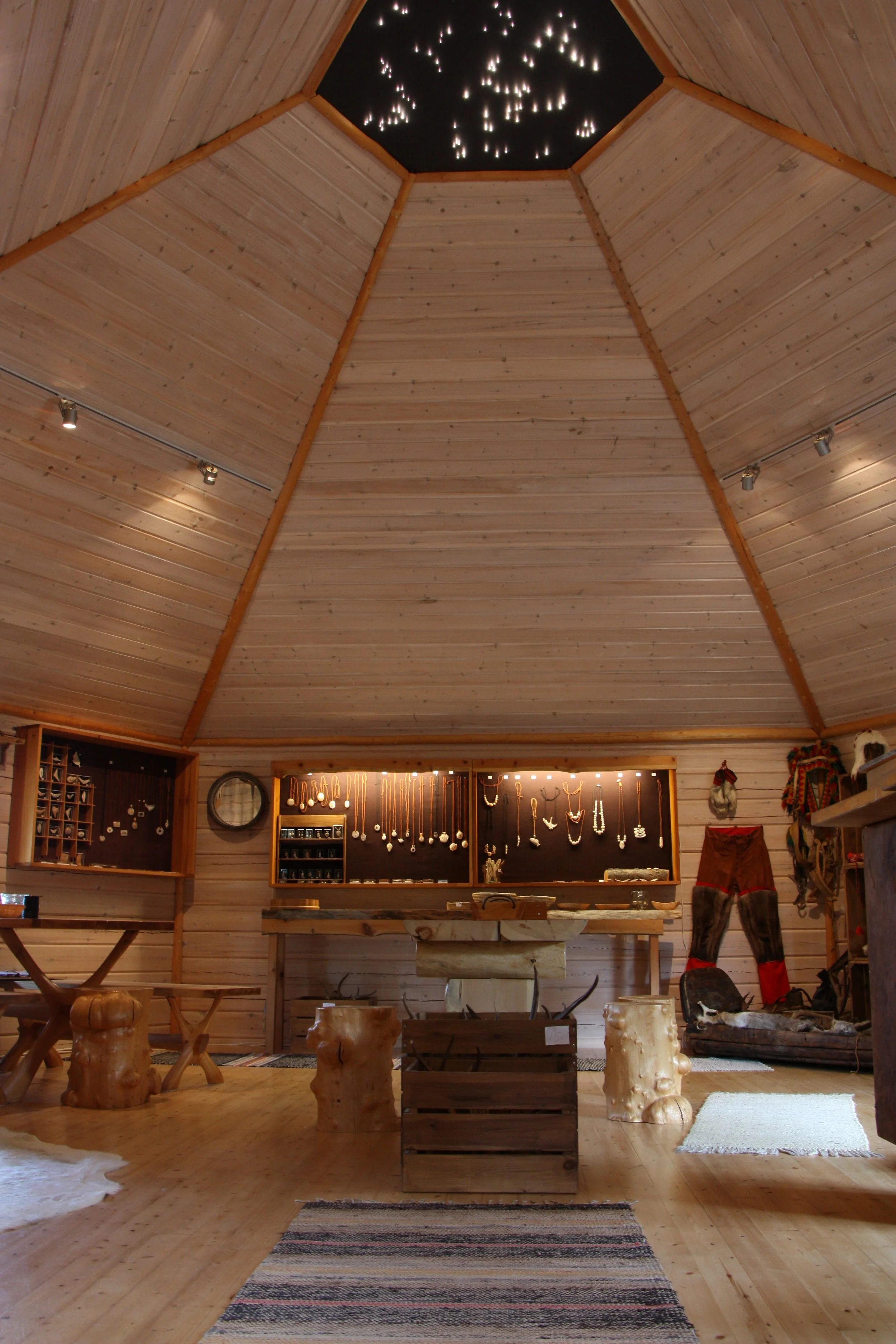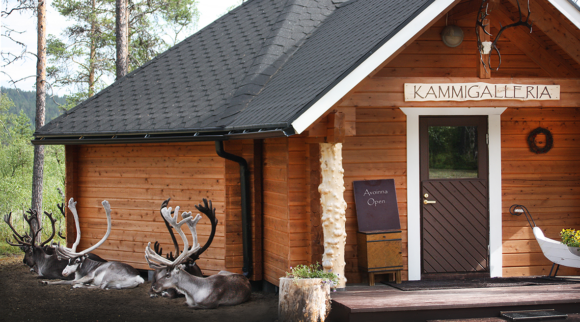 Kammigallery is a new, hexagonal shaped loghause with exhibition of arts and crafts made of reindeer antlers, leather and bones. It situates on the shore of Lake Kuivajärvi, nearby the Lemmenjoki National Park on our reindeer farm.